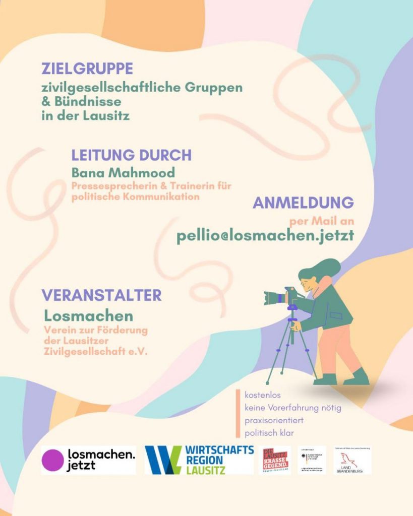 Du bist in der Lausitz in einer Initiative für Demokratie, Antirassismus oder Naturschutz aktiv und möchtest eure Botschaft in die Öffentlichkeit tragen und die Basics der Presse- und Medienarbeit lernen? Dann komm zur Workshopreihe „Öffentlichkeitsarbeit in Zeiten des Rechtsrucks“. Es sind keine Vorkenntnisse nötig.